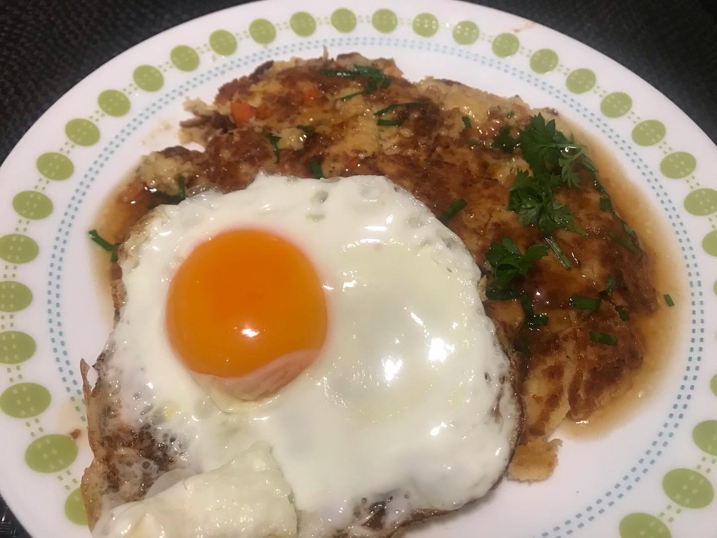 ソースを掛けた上に目玉焼きをのせる。